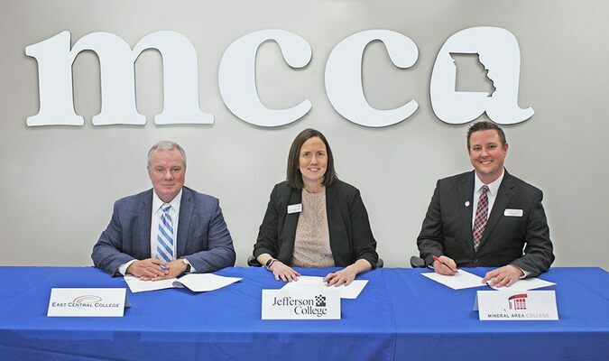 The presidents of East Central College, Dr. Jon Bauer; Jefferson College, Dr. Dena McCaffrey; and Mineral Area College, Dr. Joe Gilgour, inked the agreement Wednesday, April 6, at the MCCA office in Jefferson City.