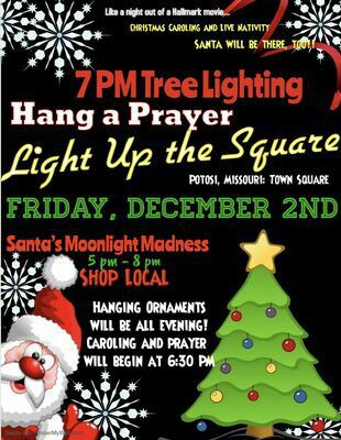 The Potosi Assembly of God Church is coordinating the ‘Hang A Prayer - Light Up The Square’ evening again this year on Friday, Dec. 2nd, 2022 at the Towne Square parking lot across from the County Courthouse. The evening will begin at 5:30 p.m. with hanging ornaments on the community Christmas Tree & caroling and prayers at 6:30 p.m. for the season and the community.